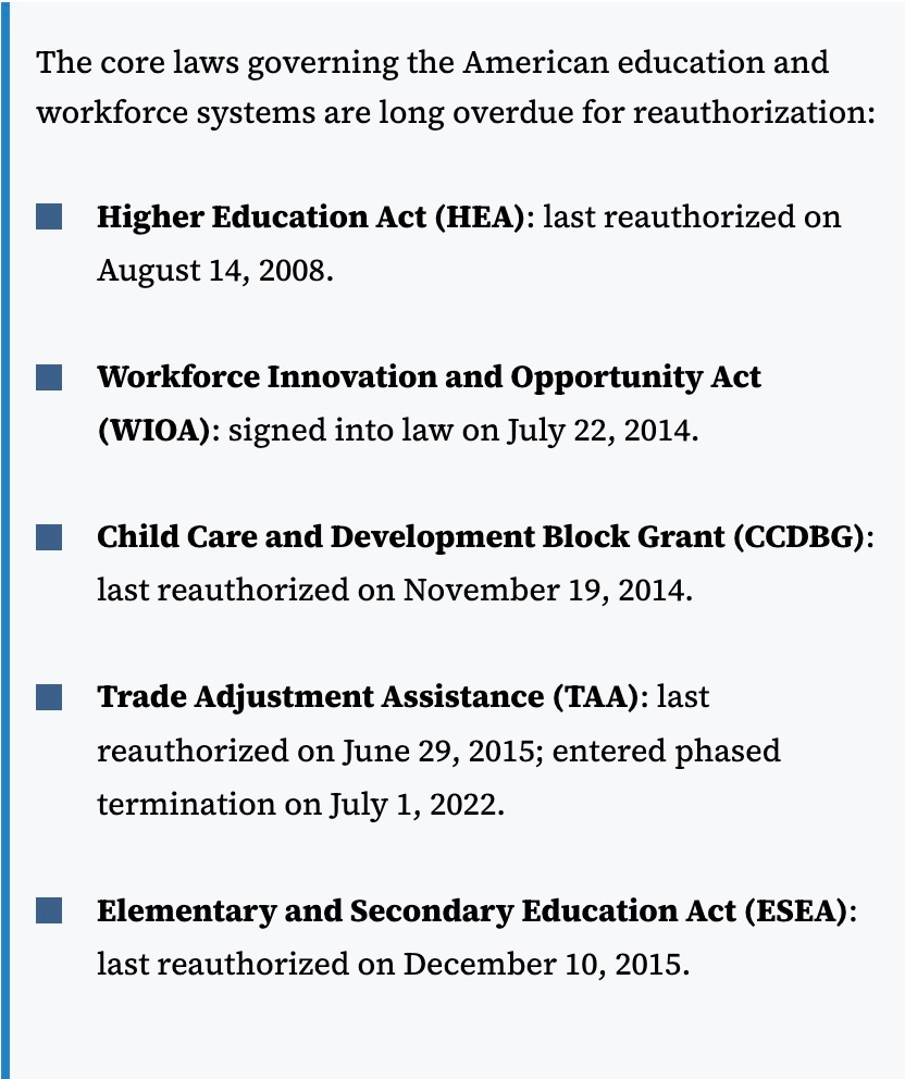 We’ve talked in a recent episode about IDEA, the Individuals with Disabilities Education Act, not being reauthorized for over 20 years. The top of the webpage that hosts this report points out that a lot of these federal laws haven’t been reauthorized for a really long time. Why is that? Is Congress afraid to tackle these issues? Are other issues just drawing their attention elsewhere?