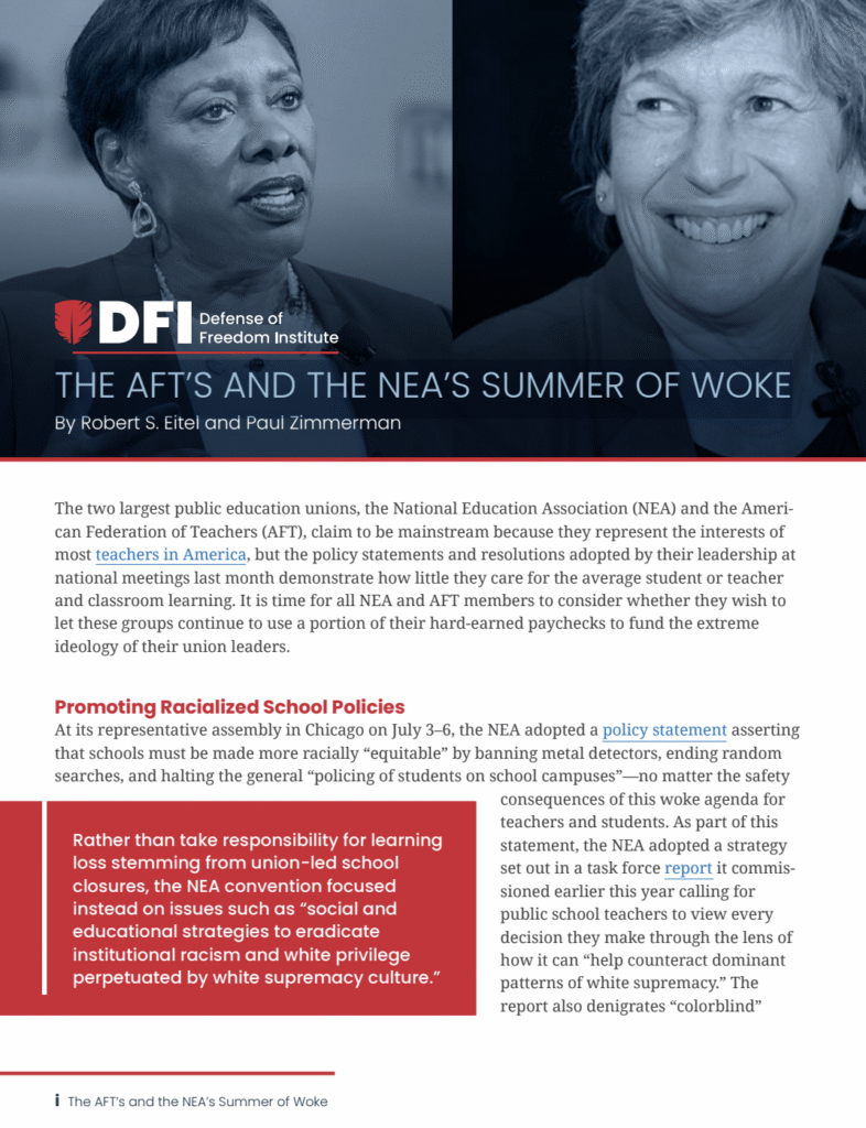 The two largest public education unions, the National Education Association (NEA) and the American Federation of Teachers (AFT), claim to be mainstream because they represent the interests of most teachers in America, but the policy statements and resolutions adopted by their leadership at national meetings last month demonstrate how little they care for the average student or teacher and classroom learning. It is time for all NEA and AFT members to consider whether they wish to let these groups continue to use a portion of their hard-earned paychecks to fund the extreme ideology of their union leaders.